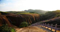 景區(qū)地質(zhì)構造較復雜。區(qū)內(nèi)地貌類型多樣,既有典型的丹霞地貌,又有喀斯特溶洞景觀,公園集紅巖丹霞地貌,溶洞、碧水,溫泉于一體,更兼有古樸人物景觀之襯托。青山、綠水、紅崖赤壁、竹林深深,構成一幅雄、奇、險、秀,美輪美奐的自然畫卷。